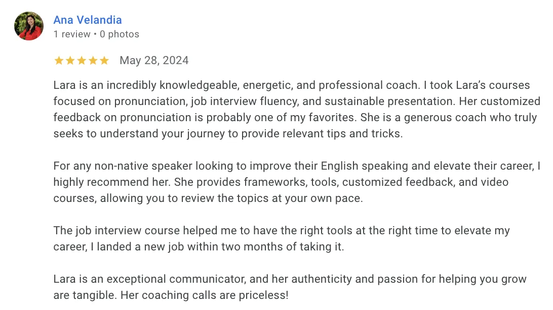 You can either reply to the email you will receive where I ask you about your goals, or you can schedule a free 30-minute conversation with me before your first session. Based on your struggles and goals, I will design 4 lessons for you to address key strategies or language structures that can help. With over 20 years of experience with listening, assessing, and identifying English speakers for how they can improve quickly, I can assure you that you are in good hands. Feel free to check out what other clients have said on my coaching page: https://www.english4sustainability.com/coachingwithlara